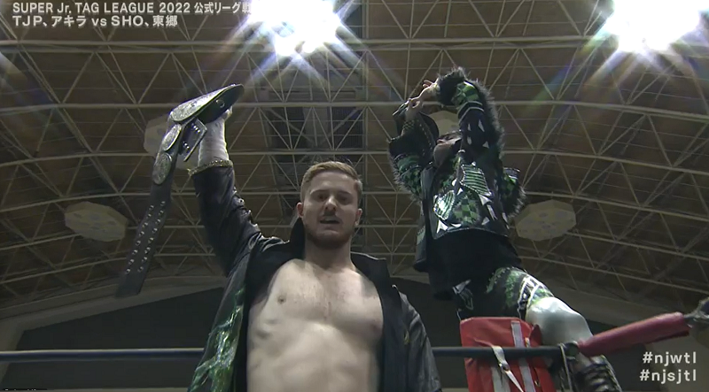 Out on the floor, TJP was held in place for a PK off the apron before Akira took one as well. Back in the ring, TJP would be dropped throat first on the bottom rope, before Togo would set up the running fist drop for a two count. SHO would go after the eyes of TJP during a chinlock, before TJP broke free and hit the tornado DDT. Akira would roll SHO into a double stomp, before SHO would use the referee as a shield and nail the spear.