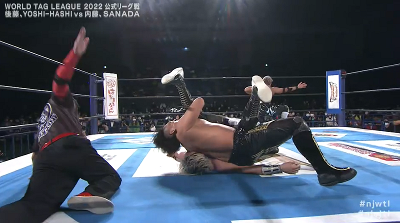 SANADA would keep the pressure on YOSHI-HASHI, before Naito would apply the Leg Nelson in the middle of the ring. Goto would save his partner, before being taken out by Naito. YOSHI-HASHI would find himself trapped in the Paradise Lock, only to be freed by a stiff dropkick.