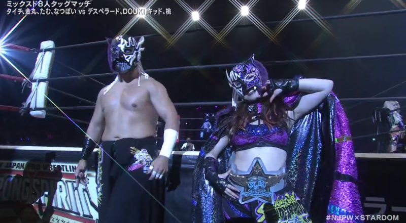 It’s not often we see factions in NJPW fight each other, but that is the case as Suzuki-gun meet in eight man tag team action – with handpicked Stardom partners. Taichi & Yoshinobu Kanemaru had their eyes on MelTear, the duo of Natsupoi & Tam Nakano – who came together after a vicious singles feud built mutual respect. Meanwhile, El Desperado & DOUKI were an instant match with the dark hearted Starlight Kid & Momo Watanabe, better known as Black Desire.