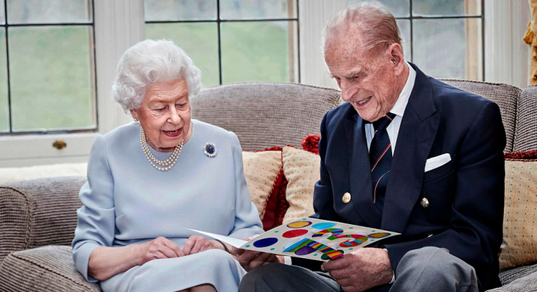 In this handout image released by Buckingham Palace on November 19, 2020, Britain's Queen Elizabeth II (L) and Britain's Prince Philip, Duke of Edinburgh (R) look at a homemade wedding anniversary card, given to them by their great grandchildren, Prince George, Princess Charlotte and Prince Louis in the Oak Room at Windsor Castle on November 17, 2020 in Windsor, west of London, ahead of their 73rd wedding anniversary on November 20. (Photo by CHRIS JACKSON / BUCKINGHAM PALACE / AFP) / XGTY / RESTRICTED TO EDITORIAL USE - MANDATORY CREDIT "AFP PHOTO / CHRIS JACKSON / GETTY IMAGES" - NO MARKETING - NO ADVERTISING CAMPAIGNS - DISTRIBUTED AS A SERVICE TO CLIENTS FOR THE CONTEMPORANEOUS ILLUSTRATION OF EVENTS, THINGS OR THE PEOPLE IN THE IMAGE OR THE FACTS MENTIONED IN THE CAPTION - NO ARCHIVES - THE PHOTOGRAPH SHALL NOT BE USED AFTER 4TH DECEMBER 2020, WITHOUT PRIOR PERMISSION FROM ROYAL COMMUNICATIONS. / (IMAGE STRICTLY EMBARGOED FOR USE UNTIL 2200hrs on Thursday 19th November 2020) (Photo by CHRIS JACKSON/BUCKINGHAM PALACE/AFP via Getty Images)