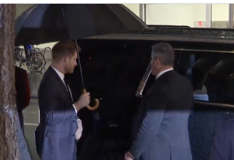 A video that has been widely shared on Twitter shows Harry ensuring that Meghan was sheltered from the rain by offering her an umbrella as she walked into the building.