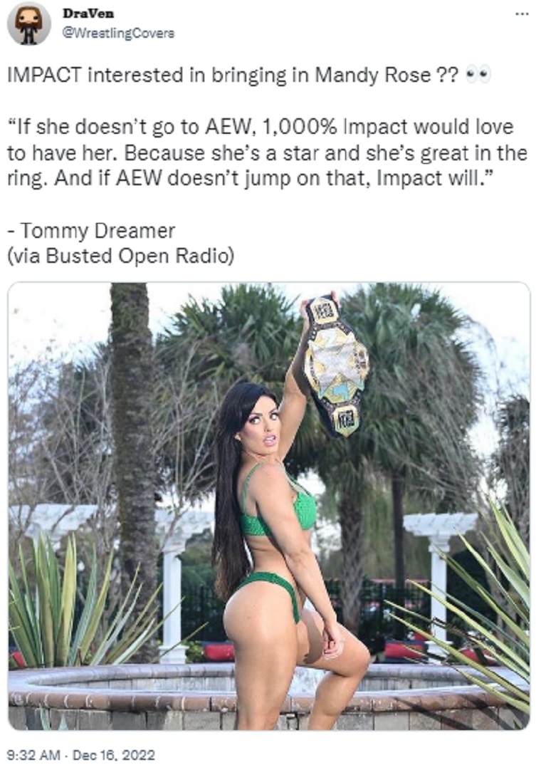 “If she doesn’t go to AEW, 1000%, Impact would love to have her, ’cause you’re a star, and you’re great in the ring. And if AEW doesn’t jump on that, hell, Impact will. Hey, Mandy Rose! Call me, text me, DM me!”
