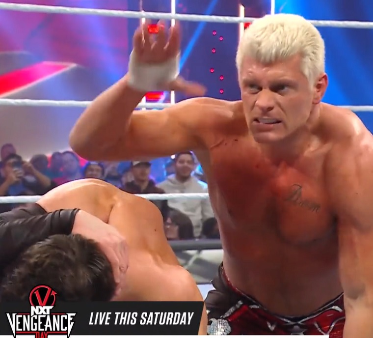 Balor worked over Cody’s arm in the ropes, but Cody caught him with a dragonscrew in the ropes, then hit a disaster kick and a dive.