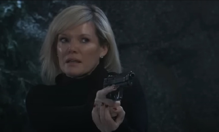 She’s about to shoot him as her finger was pressing the trigger, but we don’t think she will. Someone will come in and stop her, and it’ll leave a victorious Ryan alive to taunt her about knowing her secret about Nikolas.