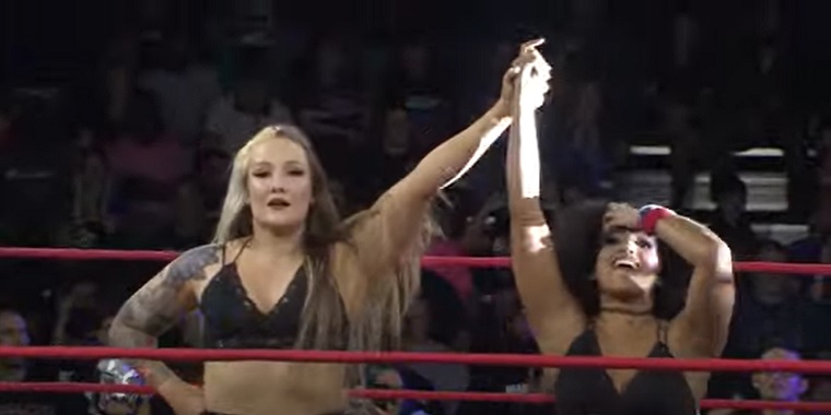 Kelly went for a tag, but Wilde kept shuffling her cards before showing a devil card to Kelly, and Taya and Rosemary hit an assisted Road to Valhalla for the win.