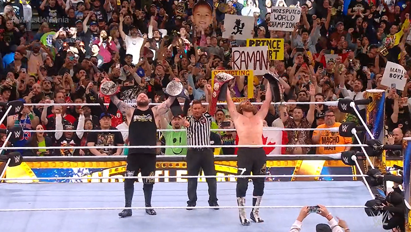 Owens would crawl up to the apron, and set up the Helluva Kick to Jey, and a stunner to Jimmy – but still the match continues. All four men would brawl it out as 80 thousand fans were on their feet.