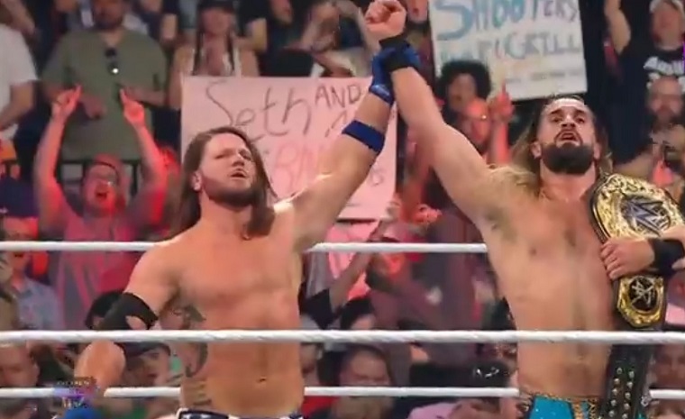 Balor blind tagged in but Rollins avoided a Coup de Grace and hit a superkick to buy time. Priest avoided a Phenomenal Forearm and hit a Razor’s Edge for a pin attempt Rollins broke up with a Stomp and Styles tagged him in.