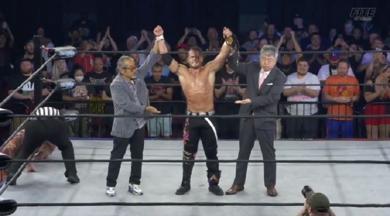 New Japan representatives gave Shelley his title belt and congratulated him and Shelly commended celebrating.