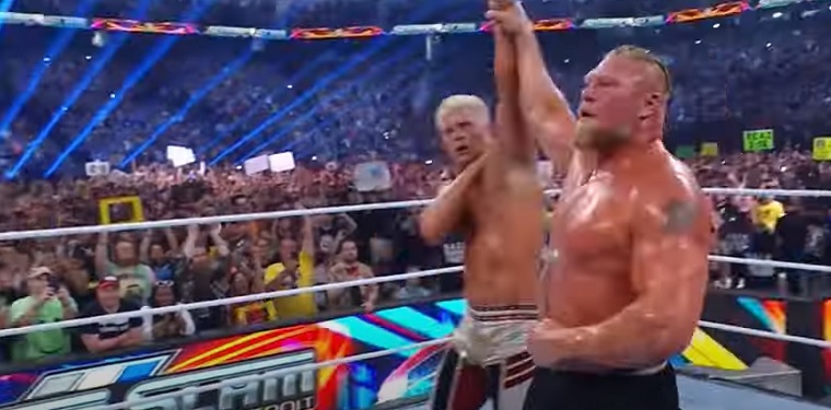 In one of the latest and coolest going off script moments, Brock Lesnar surprised everyone by shaking Cody’s hand, embracing him, and then raising his hand following Cody’s win at SummerSlam.