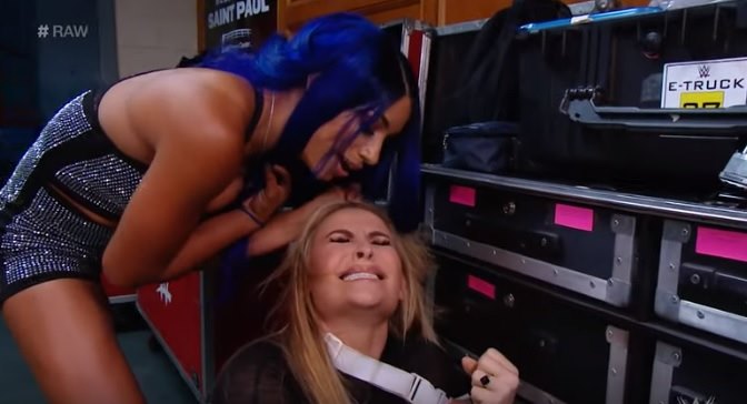 Sasha Banks claimed people were talking about her blue hair, and Michael Cole called her on it and asked her to explain why she attacked Natalya and Lynch. She responded with, “You’re welcome,” removed her microphone, and left the interview area.